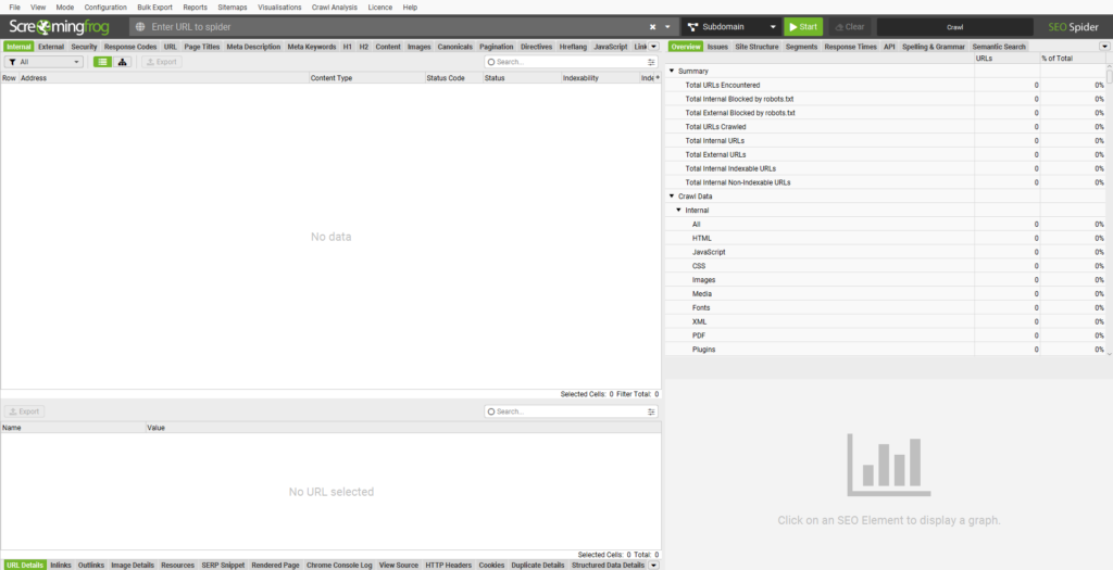Open Screaming Frog. You’ll see the main interface with a URL bar at the top, several tabs, and a bunch of columns. Don’t panic. We’ll walk through all of it.